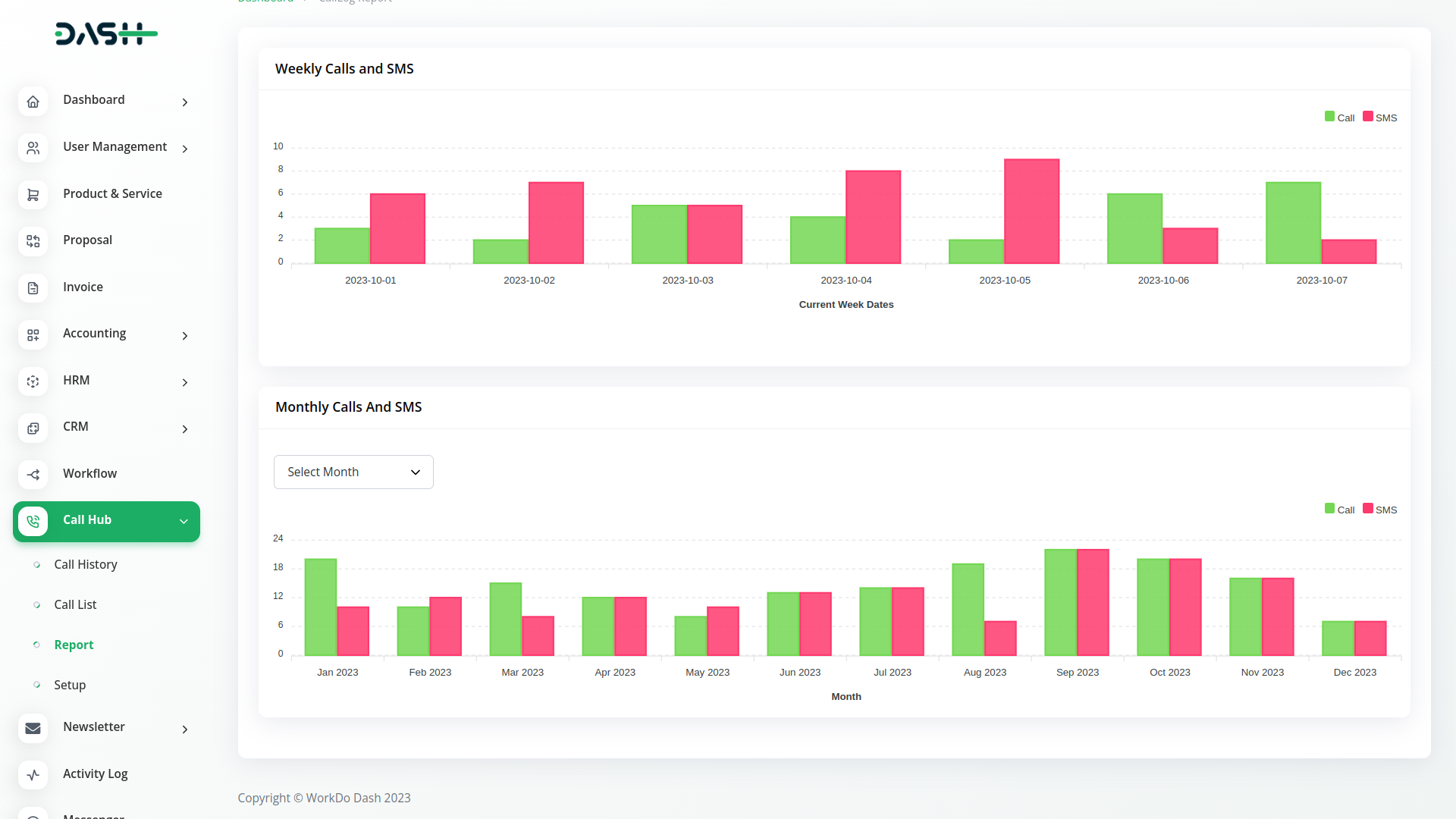 Call Hub provides robust reporting capabilities.Track the number of calls and SMS sent in a given month.Analyze communication patterns for a specific week.