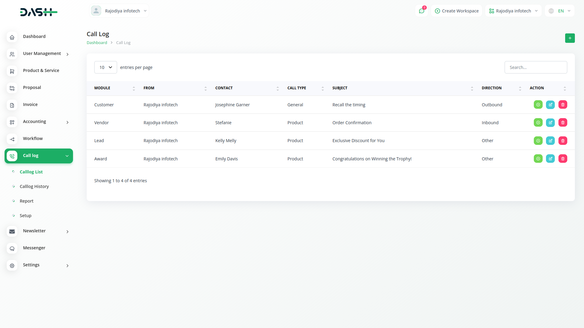 Choosing between a call or SMS communication. From the starting time and the ending time, the duration between that will counted automatically.Assigning a specific user responsible for the call and sms. Writing a custom message to send to the employee, client, or customer. Also this provide a functionality One-click call functionality to reach out to the contact instantly and One-click send message functionality for immediate messaging.
